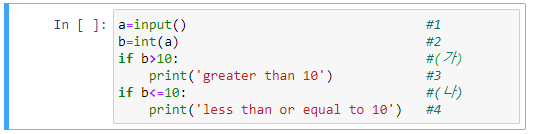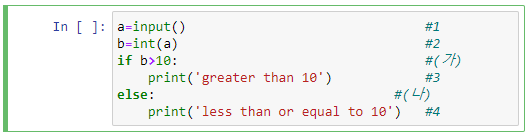 코드의 실행을 살펴 보면 #1에서, 사용자로부터 어떤 숫자를 입력받고, 그 값을 a 라고 부른다. #2에서, a 값이 문자열 값이므로 정수값으로 형 변환을 한다. 형변환된 값을 b 라고 한다. #3 명령어는 'greater than 10'이라는 문자열을 화면에 출력하는 명령어인데, 조건이 붙어 있다. 즉, b 값이 10보다 클 경우에만 실행되게 된다. #4 문장도 조건이 달려 있다. 즉, b 값이 10보다 작거나 같을 때에만 실행된다. 그래서 실제로 #4 문장에 if 조건문이 매달려 있다.