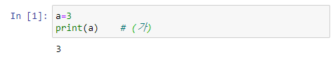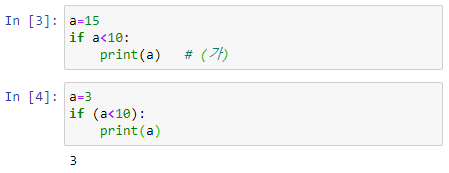 위에서 In[6]과 In[5]의 실행 결과는 동일하게 나타나고 있으나, In[6]의 (나) 문장은 조건이 있는 문장이나 In[5]의 (나) 문장은 무조건적으로 실행되는 문장이다. 참고로, a 값을 조정하여 (조건식)이 False 가 되는 아래 코드의 결과를 비교해 보자.