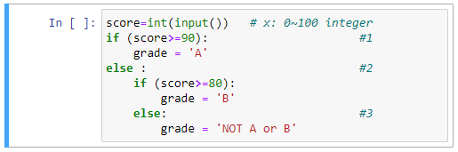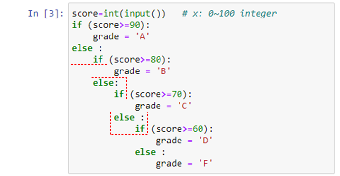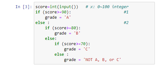 위 코드에서 #2의 else 구문이 실행이 된다는 것은 #1에서 if 문의 조건이 False 라는 뜻이니 일단 score 값은 90 미만이 된다. #2의 조건은, 이렇게 90 미만인 값 중에서, 80 이상인 경우에 해당하는 조건으로 결국 80<=score<90 에 해당하게 된다. 자 이제 전체 5개의 조건 중에서 90<=score<=100, 80<=socre<90 등의 2개 조건을 추려낼 수 있게 되었다. 아직도 완전하지는 않은 것이 C, D, F는 여전히 #3의 else 구문으로 뭉뚱그려져 있다.