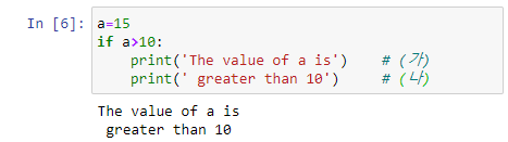 만약에 then 에 포함되는 문장이 2개 이상인 경우에는 어떻게 해야 할까? 이 때에는 해당하는 문장들을 모두 동일하게 들여쓰기 하면 된다. 예를 들어서, 아래의 In[6]에서 2개의 print( ) 문은 if 조건에 종속되어 있다. 즉, 조건식이 참이 되면 2개의 print( ) 문이 실행되어 그림과 같은 결과를 나타내게 된다.