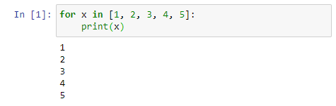 for 문의 콜론( : ) 뒤에 묶여져 있는 명령어들이 반복이 되는데, 가장 첫번째 반복은 x 값이 리스트의 첫번째 요소인 1일 때 이루어진다. 즉 x 값이 1로 assign 된 상태에서 반복이 이루어진다. for 문에 묶여져 있는 명령어들이 모두 실행이 되면 그 다음 반복이 이루어진다. 이 때는 iterator인 x 변수의 값이 리스트의 다음 요소인 2가 된다. 즉 x 값이 2인 상태로 한번의 반복이 더 이루어진다. 이러한 과정이 계속되어, x 값이 3일 때 반복이 이루어지고, x 값이 4일 때 반복이 이루어지고, x 값이 5일 때 반복이 이루어진다. 5가 마지막 값이므로, 5번째 반복이 완료된 후에 for문의 실행은 끝나게 된다.