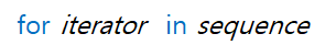 for 키워드 뒤에 변수(iterator)가 하나 오고, in 키워드가 오고, 그 뒤에 시퀀스(sequence) 타입의 데이터 구조가 온다. 시퀀스 타입의 데이터 구조는 우리가 살펴봤던 리스트, 튜플과 같이 여러 데이터가 순서대로 연결되어 있는 형태를 가지는 데이터 구조를 나타낸다. 문자열도 시퀀스 타입이다.