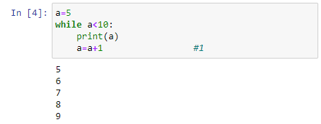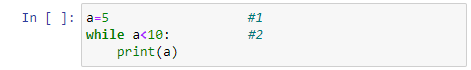 따라서 실제로는 아래와 같은 형태가 된다. #2의 조건식 연산에 필요한 a 값이 #1에서 할당되었다. a 값이 5이므로 while 의 조건문은 True 이 되어 while의 콜론( : )에 묶여 있는 문장(들)이 1회 실행된다. 우리의 예제에서는 print(a) 가 실행되어 화면에 5라는 값이 출력된다. 모든 명령어가 수행 완료되면 다시 while 의 조건식을 연산한다. a 값은 여전히 5 이므로 True 가 되고 print(a)가 1회 반복된다. 화면에 5 값이 출력되고 다시 while 의 조건식을 연산한다. 만약 조건식이 False 가 되면 while 루프를 빠져나오게 된다. 그런데, 우리 예제는 a 값이 변하지 않으므로 항상 True이 되어 끝없이 반복이 이루어지는 형태가 된다. 이런 형태를 무한 루프(infinite loop) 라고 부른다.