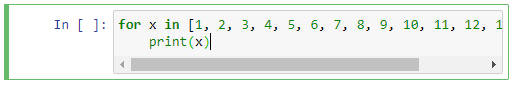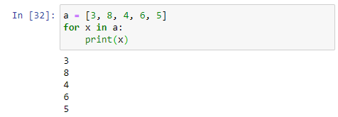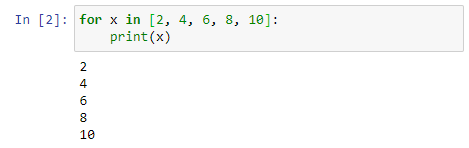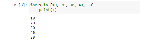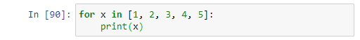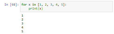 for 문의 콜론( : ) 뒤에 묶여져 있는 명령어들이 반복이 되는데, 가장 첫번째 반복은 x 값이 리스트의 첫번째 요소인 1일 때 이루어진다. 즉 x 값이 1로 assign 된 상태에서 반복이 이루어진다. for 문에 묶여져 있는 명령어들이 모두 실행이 되면 그 다음 반복이 이루어진다. 이 때는 iterator인 x 변수의 값이 리스트의 다음 요소인 2가 된다. 즉 x 값이 2인 상태로 한번의 반복이 더 이루어진다. 이러한 과정이 계속되어, x 값이 3일 때 반복이 이루어지고, x 값이 4일 때 반복이 이루어지고, x 값이 5일 때 반복이 이루어진다. 5가 마지막 값이므로, 5번째 반복이 완료된 후에 for문의 실행은 끝나게 된다.