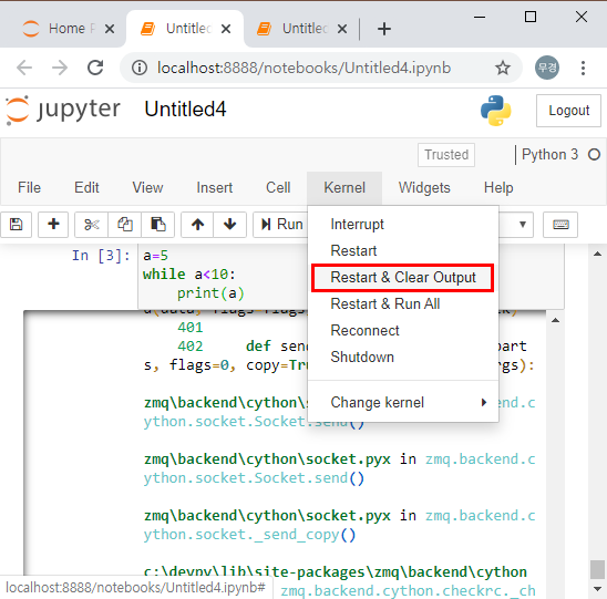 경우에 따라서는 ■ 버튼으로 실행이 종료되지 않는 경우가 있다. 이 경우에는, Kernel 메뉴에서 Restart & Clear Output 메뉴를 실행하도록 하자. 커널이란 용어가 낯설텐데, 일단, 커널(Kernel)은 우리가 입력한 파이썬 명령어를 실행시켜주는 파이썬 명령어 해석기(interpreter) 정도로 파악하고 넘어가자.