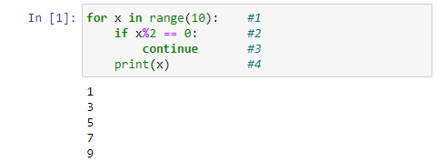 다음으로 continue를 살펴보자. for 루프에서 continue가 실행되면, (continue 문장 다음에 있는 명령어들은 무시하고) 그 다음 반복으로 넘어가게 된다. 예를 들어 보자. 아래의 코드는 iterator(반복 변수) x 값이 0, 1, ..., 10으로 10번 반복이 되는 for 루프이다. 현재 x 값이 2라고 하자. 그러면, #2에서 조건식이 True 가 되면서 continue가 실행된다. continue 명령어가 실행되면 for 루프 내의 나머지 명령어 (예제 코드에서는 #4)는 생략하고 다음번 반복으로 넘어간다. 실제로, 출력 결과에 2 값이 없음을 확인해 보기 바란다. 여기서, 다음번 반복은 반복변수(iterator) x 값이 3이 되는 반복이다. 참고로, #2에서 조건식 x%2 == 0 은 어떤 값 x를 2로 나누었을 때 나머지(x%2) 값이 0이면, 즉, 짝수이면 True 가 된다.