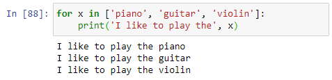 리스트에 포함되어 있는 "각 악기이름에 대하여" I like to play the ( 악기명 ) 을 출력하는 명령어이다. 첫번째 반복에서는 x 값이 'piano' 이다. 첫번째 반복에서 x 값을 출력해 보면 당연히 'piano' 라는 문자열이 보일 것이다. 두번째 반복에서는 x 값이 'guitar'로 바뀐다. 두번째 반복에서 x 값을 출력해 보면, 너무도 당연히 'guitar' 라는 문자열 값이 보일 것이다. 요소의 수가 3개이기 때문에 세번의 반복이 이루어진다. 마지막인 세번째의 반복에서는 'violin'이 x 값이 된다.