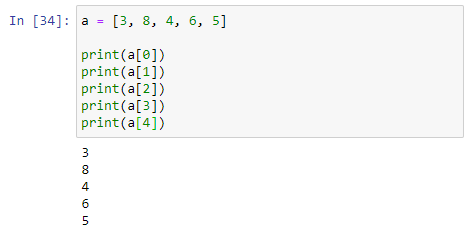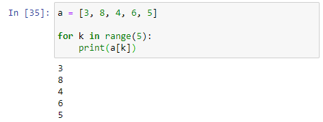 반복이 보이는가? 인덱스 값이 k가 0, 1, 2, 3, 4 로 변함에 따라 print(a[k]) 가 반복되는 형태로 볼 수 있다. 이를 for 문을 바꾸어 보면 아래와 같다.