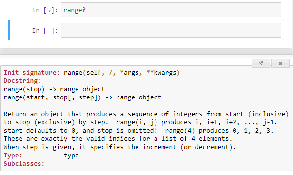 range( ) 함수의 설명을 보면 다음과 같다. (# 참고로, 주티터 노트북에서 어떤 이름 뒤에 물음표(?)를 붙이면 그 이름에 대한 설명이 팝업된다. "range 라는 이름이 뭐지?" 라는 의미에서 range? 라고 쓰면 된다)