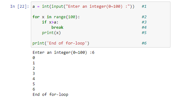 아래의 예제는 0 부터 100까지 카운트를 하는 중에, iterator 변수 값 (x 값)이 사용자가 입력한 값 (a값) 보다 크면 break 가 실행되어 for 루프를 종료하게 되는 코드이다. for 루프의 iterator 변수인 x 값은 0부터 1씩 증가한다. 만약에 a 값이 6이라면 x 값이 6보다 작거나 같은 동안은 (즉, x 값이 0, 1, 2, 3, 4, 5, 6 인 동안) #3의 조건식이 False 가 되어 break 가 실행되지 않는다. 그래서 #5 명령어인 print(x)가 실행되어 화면에 출력이 된다. 그런데 x 값이 7이 되면, #3의 조건식이 참이 되면서(7>6), break 가 실행된다. break 가 실행되면 그 문장을 포함하고 있는 for 루프 (#2에서 #5 까지)를 완전히 빠져나와서 #6 명령어가 실행되게 된다.
