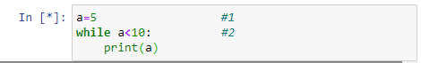따라서 실제로는 아래와 같은 형태가 된다. #2의 조건식 연산에 필요한 a 값이 #1에서 할당되었다. a 값이 5이므로 while 의 조건문은 True 이 되어 while의 콜론( : )에 묶여 있는 문장(들)이 1회 실행된다. 우리의 예제에서는 print(a) 가 실행되어 화면에 5라는 값이 출력된다. 모든 명령어가 수행 완료되면 다시 while 의 조건식을 연산한다. a 값은 여전히 5 이므로 True 가 되고 print(a)가 1회 반복된다. 화면에 5 값이 출력되고 다시 while 의 조건식을 연산한다. 만약 조건식이 False 가 되면 while 루프를 빠져나오게 된다. 그런데, 우리 예제는 a 값이 변하지 않으므로 항상 True이 되어 끝없이 반복이 이루어지는 형태가 된다. 이런 형태를 무한 루프(infinite loop) 라고 부른다.