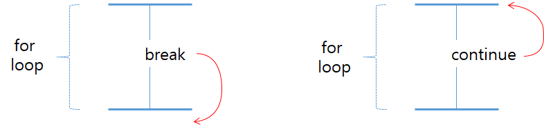 continue와 break를 활용해서, 반복을 좀 더 fine(세밀?) 하게 통제할 수 있다. 기본적인 동작은 아래의 그림에 나타낸 바와 같이, 반복문 내에서 break 명령어가 실행되면, 전체 루프가 종료가 되는데 비해, 반복문 내에서 continue 명령어가 실행되면, 혹시 남아있는 명령어가 있더라도 무시하고 다음 번 반복으로 넘어간다.
