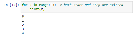 range( ) 함수에서 start나 step 값은 생략할 수 있다. start를 생략하면 디폴트 값으로 0이 사용되고, step 값을 생략하면 디폴트 값으로 1이 사용된다. 단, start 값 만을 생략하는 경우는 불가능하다. 그래서 아래의 경우만 가능하다