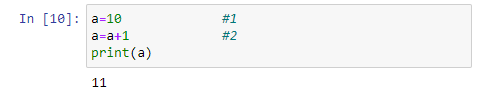 간혹 어려움을 겪는 코드 중에 하나가 a=a+1이다. 사실은 어렵지 않은 코드인데, 몇몇 학생들이 간혹 오해하는 경우가 있어 사족이겠지만 설명을 추가하고자 한다. 일단 "a=" 이라는 부분은 "a에다 저장해라" 또는 "a가 가리켜라"로 해석하면 된다. 그럼, 뭘 저장하고, 뭘 가리키라는 말인가? "a+1" 값을 저장하라는 뜻이다. a+1 값은 어떻게 결정되나? 현재 a 변수의 값에다 1을 더한 값이다. 아래의 코드를 보자. #1에서 a에 10이 저장되었다. #2에서 a+1 값을 구하면 11 값이 되고 #2 문장은 결국 "a=11"과 같이 실행된다. 쓰고보니 사족이 맞았다 ㅠ