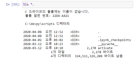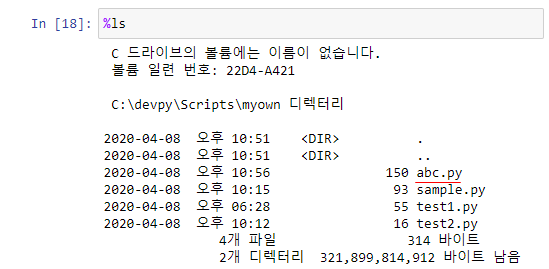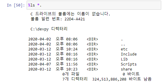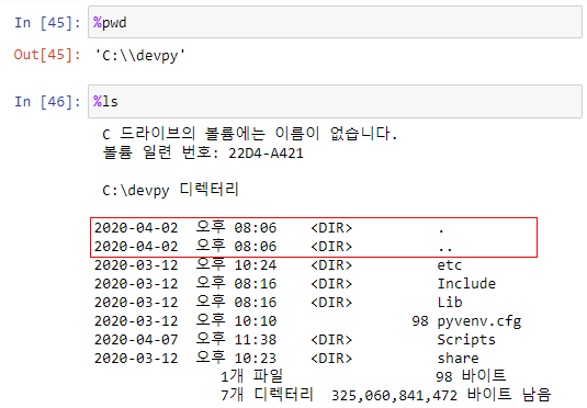 %ls 는 list 의 준말로, 현재 폴더의 내용 (현재 폴더에 포함되어 있는 폴더들과 파일들) 의 리스트를 보여주는 매직 명령어이다. In[42]는 현재 폴더 (c:\devpy)의 내용들을 보여 주고 있다. 빨간색 박스로 표시한 부분을 제외하면 7줄의 내용이 있는데, 이 중 <DIR> 로 표시된 줄은 디렉토리를 표시하고, <DIR> 이 없는 줄은 파일을 표시한다. 내용을 살펴보면, 현재 devpy 폴더 내에는 etc, Include, Lib, Scripts, share 라는 이름으로 5개의 디렉토리가 있다. 파일로는 98바이트 크기의 pyvenv.cfg 파일이 있음을 알 수 있다.