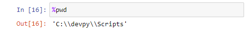 실제로 %pwd 라는 매직 명령어를 실행하면 아래와 같이 현재의 폴더 경로를 보여준다. 참고로, 도스(DOS)나 유닉스(Unix)에서는 폴더를 디렉토리라고 부른다. 아래의 실행 예를 보자. %pwd 매직 명령어가 실행되고 결과로 'C:\\devpy\\Scripts' 가 출력되었다. (여기서, 백슬래쉬와 \ 심볼은 같은 문자이다.) 이것은 현재의 작업 폴더가 C:\devpy\Scripts 라는 것을 나타낸다. 경로를 나타낼 때에는 백슬래시가 하나만 사용되는데, %pwd의 출력에서 2개의 백슬래시가 사용되고 있음에 유의하자 (관련 내용은 [python 14 파이썬 문자열] 에서 다룬 이스케이프 문자를 참고하기 바람)