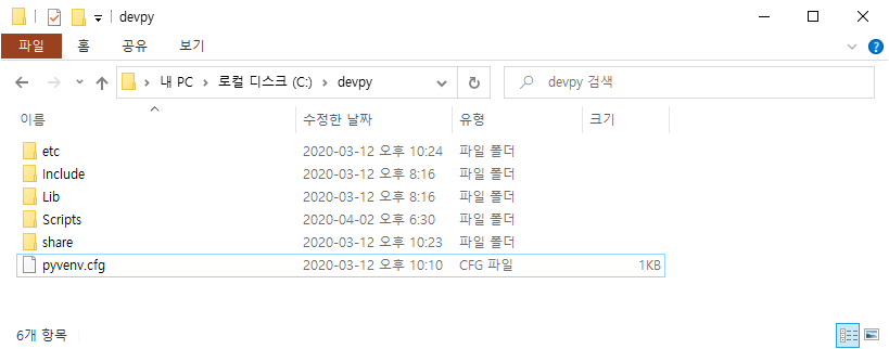 실제의 예를 한번 살펴보자. 아래는 파이썬의 가상환경이 설정되어 있는 c:\devpy 폴더 내의 내용을 보이고 있다. devpy 폴더 안에는 etc, Include, Lib, Scripts, share 라는 이름의 5개 서브 폴더가 있고 pyvenv.cfg 라는 이름의 파일이 하나 저장되어 있다.