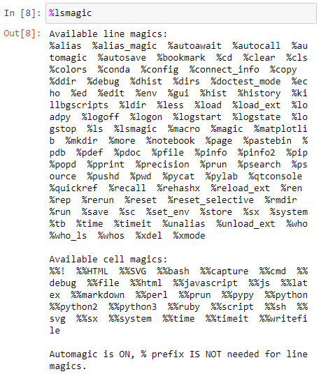 참고로, % 하나로 시작하는 명령어가 있고, % 2개 (%%) 로 시작하는 명령어가 있다. % 하나로 시작하는 매직 명령어를 line 매직 명령어, %%로 시작하는 명령어를 cell 매직 명령어로 구분한다. 명령어의 효과가 1개 라인에만 미치면 라인 매직 명령어가 되고, 여러 줄에, 즉 셀 전체에, 영향을 미치면 셀 매직 명령어가 된다.