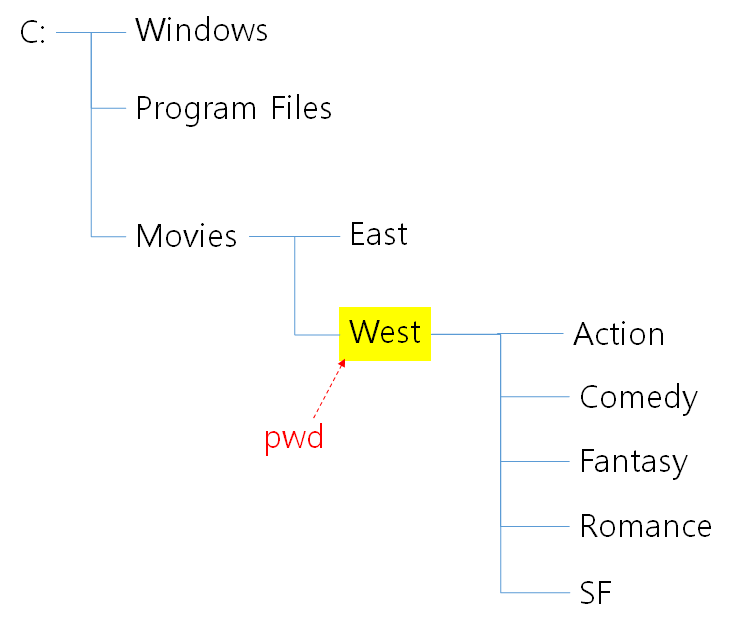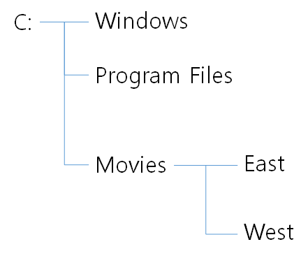 이 경로들을 그림으로 나타내면 Tree (나무) 가 된다. c:를 뿌리로 해서 3개의 가지(branch)가 벌어지는데, 한 가지는 이름이 Windows 이고, 또 한 가지는 Program Files 이고, 나머지 한 가지는 Movies 이다. Movies 가지에서 또 2개의 가지로 나뉘는데 East 와 West 가 그것이다. 여기서 c: 를 나무의 뿌리라는 의미에서 root 디렉토리라고 부른다. 그리고 하나의 폴더를 기준으로 그 폴더를 포함하는 상위의 폴더가 있고, 그 폴더가 포함하고 있는 하위의 폴더가 있다. 상위의 폴더를 부모 디렉토리 (parent directory) 라고 부르고 하위의 폴더를 서브 디렉토리 (sub directory) 라고 부른다. 아래의 예에서 Movies는 West의 부모 디렉토리이고, West는 Movies의 서브 디렉토리가 된다.