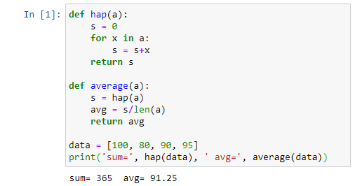 위의 파이썬 파일을 %run 매직 명령어를 사용하여, 주피터 노트북에서 바로 실행할 수 있다. 그러면, 파일 내에서 함수의 정의이거나 변수의 선언이 아닌 명령어가 순차적으로 실행된다. 우리의 abc.py에서 명령어는 print( ) 문 밖에 없다. print( ) 문이 실행되면서 hap( ) 과 average( ) 가 호출이 이루어지는 형태로 만들어져 있다.