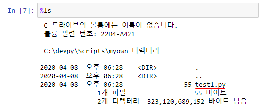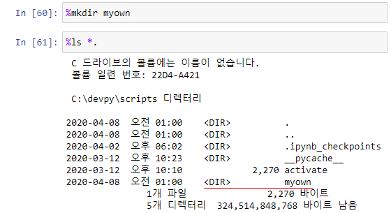 여기에, 내가 만들 파이썬 파일들을 저장하는 용도로 myown 이란 이름의 폴더를 만들고자 한다. 그럼 현재 폴더에서 %mkdir myown 이라고 하면 된다. %mkdir [폴더 이름] 하면 [폴더 이름]에 해당하는 이름의 폴더가 현재 폴더 (pwd) 의 서브 디렉토리로 만들어 진다. 아래에서 그 결과를 살펴보자.