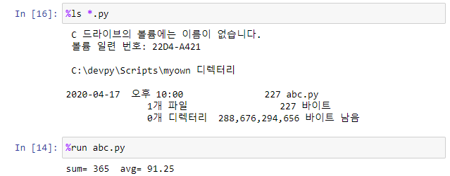 실제로 abc.py 파일의 내용을 복사하여 주피터 노트북의 셀에서 실행했더니 %run 과 똑같은 결과를 나타내는 것을 확인할 수 있다. 아래의 그림을 참고하기 바란다.