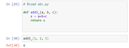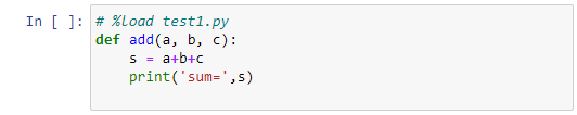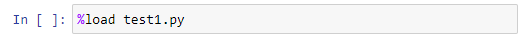 %load는 컴퓨터에 저장되어 있는 파이썬 파일을 불러와서 수정할 수 있는 매직 명령어이다. 위에서 저장했던 test1.py 의 내용을 확인하거나 수정하고 싶은 경우에는 %load test1.py 를 실행하면 된다. 물론, 현재 디렉토리(pwd)에 해당 파일이 존재해야 한다. 셀에서 아래와 같이 명령어를 입력한 후에 엔터키를 누르면