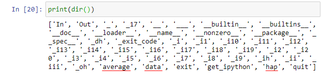 실제 %run 으로 실행한 후에 dir( )을 보면 abc.py 파일 내에서 선언되었던 average, data, hap 이란 이름이 리스트되어 있다. 무슨 얘기인가? 일단 abc.py를 주피터 노트북에서 실행하게 되면 실제 그 파일의 내용을 주피터 노트북의 셀에서 실행하는 것과 똑같은 효력을 가진다는 것이다.