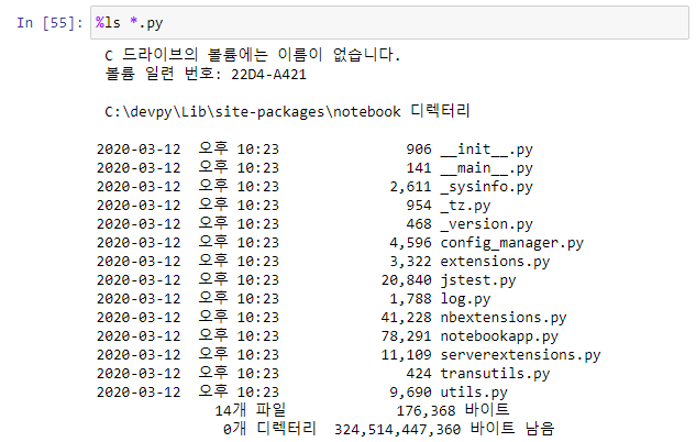%ls 명령어 뒤에 옵션을 넣어 필요한 내용들만 선별하여 볼 수 있다. 특별히, 현재 폴더에 있는 파일들 중 확장자가 .py 인 파일들의 리스트 만 보고 싶다면 %ls *.py 라고 하면 된다. 여기서 *는 와일드 문자(wild character)라고 부르고 문자의 개수에 무관하게 모든 이름과 매치가 된다. 즉, 확장자가 .py인 모든 이름의 파일을 보여 달라는 명령이 된다. 예를 보이면 아래와 같다. 리스트된 모든 파일의 확장자가 .py 라는 것에 유의하자.