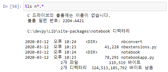 만약에 확장자 무관하게 파일이름이 n 으로 시작하는 파일이나 폴더의 리스트를 보고 싶다면 %ls n*.* 이라고 하면 된다. 아래의 사용예를 보자.