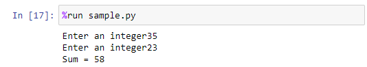 %run 은 파이썬 파일을 실행하는 명령어이다. 예를 들어, 다음과 같이 3개의 명령어로 구성된 sample.py 파일을 만든 경우에 %run sample.py 를 실행하면 해당파일의 명령어를 바로 실행할 수 있게 된다.