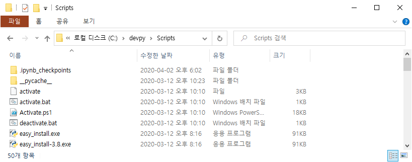 여기서, 임의로 Lib 라는 폴더를 클릭하게 되면, 탐색기의 모양은 다음 그림과 같이 바뀌게 된다. 현재 탐색기는 c 드라이브 밑에 있는 devpy 폴더의 서브 폴더인 Scripts 의 내용을 보이고 있다.