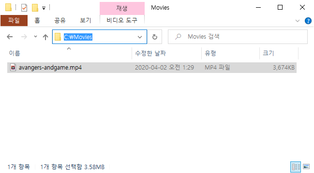 현재 c 라는 이름의 하드디스크 (보통 c: 라고 표시하고 c 드라이브라고 부른다) 에는 Windows (윈도우 운영체제가 설치된 폴더), Program Files 폴더 (각종 애플리케이션들이 설치된 폴더) 가 있다. 이 폴더에 영화를 넣기는 이상해서 새롭게 Movies 라는 이름으로 폴더를 하나 만들었다. 그리고 영화 파일을 c:\Movies 라는 폴더에 옮겨 두었다.