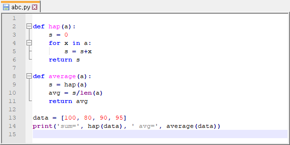 abc.py 파일을 수정해 보았다. 아래의 abc.py 파일에는 3개의 선언이 포함되어 있다. 먼저 2개의 함수 hap( ) 과 average( ) 가 선언되어 있고, data 라는 변수가 하나 선언되어 있다.