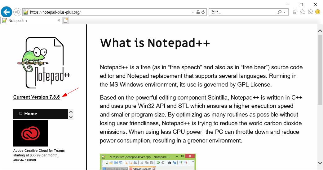 노트패드++는 윈도우즈에서 기본으로 설치되는 https://notepad-plus-plus.org 에서 무료로 구할 수 있다. 화면 좌측 프레임의 중간에 Current Version 7.8.5 링크를 클릭하면 최근버전의 노트패드++를 다운로드 받아 설치할 수 있다.