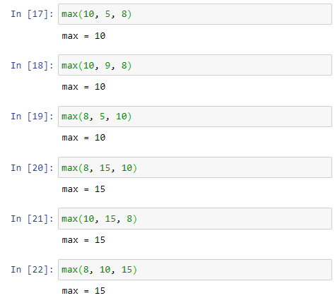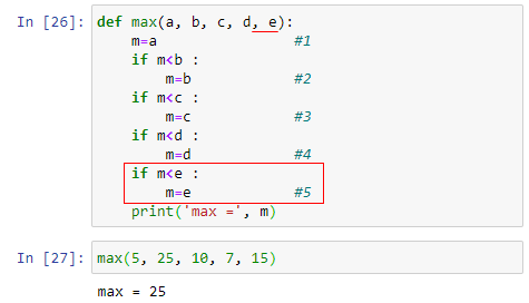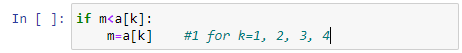 그래서, 최대값을 구하는 전체 코드는 다음과 같은 형태가 된다. 여기서 각각의 if 문은 아래의 코드처럼 일반화시킬 수 있겠다. 이전에 [반복을 위한 for, while] 제목의 글에서 for 반복문과 리스트는 천생연분의 조합이라고 했었는데, 그 좋은 예제가 되겠다.