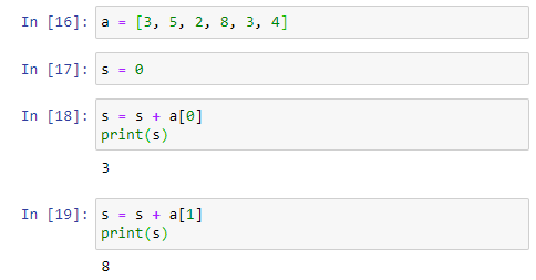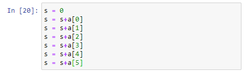 In[16] 에서 더할 데이터를 준비했다. In[17]에서 비어 있는 비이커를 준비했다. In[18]에서 s = s+a[0] 를 실행하는데 이 명령어는 s 에다 저장하시오 (s = ) 무슨 값을 ? = 기호의 오른편에 있는 값 s + a[0] 를. 현재까지는 s 에 저장될 값이 결정되어 있지 않다. 현재의 s 값과 a[0]를 더해 봐야 s 에 저장될 값을 알아낼 수 가 있다. 현재의 s 값은 0 이고 a[0]는 3 이므로 s 에 저장될 값은 3이 된다. 즉, s = s+a[0] 명령어는 결국 s = 3으로 실행된다. ln[18]에서 print(s) 했더니 3 값이 출려된 것을 확인해 주기 바란다.