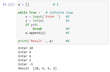 #1 에서 비어 있는 리스트를 하나 준비한다. While 루프를 통해 입력된 데이터를 이 리스트에 저장(append) 하게 될 것이다. #2와 #3에서 데이터를 입력받는다. #4에서, 그 값이 음수이면 전체 루프를 break (빠져 나오게) 된다. 그렇지 않으면, #5 명령어가 실행되어 입력된 데이터가 리스트에 추가되게 된다. 음수가 입력되어 while 루프를 빠져 나오게 되면, #6에서 그 결과를 화면에 출력하게 된다.