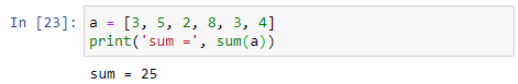 근데, 여기서 드는 궁금증 하나. 파이썬의 내장 함수 중에 sum( ) 함수가 있는데 그 함수를 바로 사용하면 안되나 하는 의문이다. 아래의 코드를 보자. 정말 단순한데 우리가 원하던 결과를 구해주고 있다.