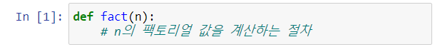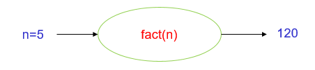 이 함수를 호출할 때 n에 어떤 정수값 인자를 전달하게 된다. 예를 들어 fact(5). 여기서 5가 fact 함수의 입력값에 해당한다. 그러면 fact 함수는 내부의 정해진 절차에 따라 (아마) 5*4*3*2*1 인 120을 계산하여 출력해 줄 것이다.