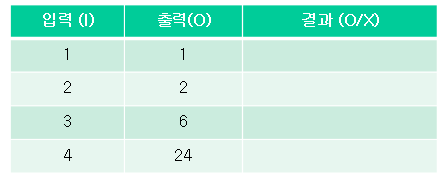 위의 그림에서 보다시피, 출력(y)은 입력데이터(x)와 절차(f)에 따라 달라진다. 결국 y = f(x) 인 것이다. 무슨 말이다? 우리가 만든 fact( )함수가 올바로 동작하는지는 입력데이터를 임의로 줬을 때, 출력데이터가 우리가 기대하는 값을 확인함으로써 확인할 수 있다. 이와 같이, 하나의 입력데이터와 하나의 출력데이터를 묶어서 테스트 케이스(test case)라고 부른다. 보통 (I, O) 로 나타내는데, 우리 문제의 경우에는 (5, 120)인 셈이다.
