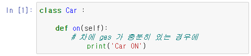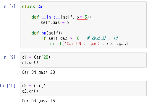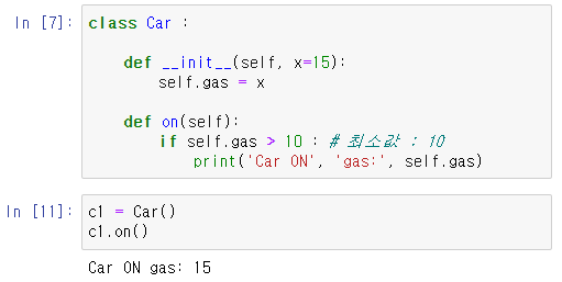 하지만, 일단 인스턴스 변수를 하나 추가하기로 했다면 추가적으로 정해주어야 할 요소들이 있다. 첫번째는 인스턴스 변수의 초기화 (initialization)이다. 즉, 객체가 만들어질 때, 각 객체의 인스턴스 변수 값을 얼마로 할 것인지에 대한 고려이다. 우리가 이미 너무 잘 알고 있다시핑, __init__( ) 함수를 이용해서 객체의 인스턴스 변수를 초기화할 수 있다. 초기값을 결정하는 방법은 2가지가 있다. 첫째는 디폴트(default) 값을 사용하는 경우이다. 아래의 코드를 참고해 보자. __init__( ) 함수에서 gas 값을 15로 초기화하였고, 이후에 on( )함수 호출에서 if 조건이 체크가 되고 참(True)이 되므로 이 Car는 결국 시동이 걸리게 된다.
