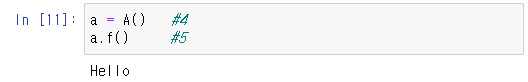 그래서 A 객체를 하나 생성(아래의 #4) 한 후에 실제 f( ) 하라고 요청(#5)해 보면 아래와 같은 응답(response)가 나타나는 것을 확인할 수 있다. 여기서, a.f( ) 는 "a 객체가 f( ) 하기를 요청한다"는 의미가 된다.