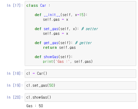 setter, getter 얘기를 하다 잠시 삼천포로 빠졌는데 다시 원래 위치로 돌아와 보자. set_gas( ) 메쏘든 Car 객체에게 "gas 값을 바꿔주세요" 라고 하는 요청이 된다. 하지만, 이 자체 만으로는 문장이 완성되지 못한다. "gas 값을 바꿔 주세요" 무엇으로? "50으로". 즉, 바꿀 값을 인자값으로 넘겨주는 형태가 되어, 메쏘드의 정의는 def set_gas(self, x)의 형태가 되고, 함수 호출도 c1.set_gas(50)의 형태가 된다. getter 메쏘드의 경우에는 Car 객체에게 "현재의 gas 값을 알려주세요"라는 요청이 되어, 메쏘드 정의는 def get_gas(self)의 형태가 되고, 현재의 gas 값을 리턴(return)하게 된다. 거의 모든 setter와 getter가 이런 형태를 갖게 된다. 실제 실행된 In[19] 의 setter와 In[20]의 getter를 살펴보기 바란다.