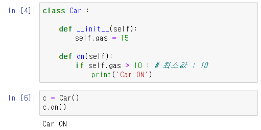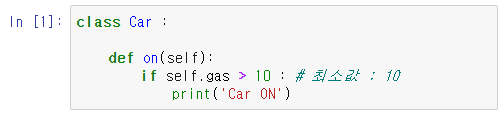 즉, 모든 Car 들은 on( )이라는 기능을 수행하는데 영향을 주는 "gas의 양" 이라는 특성을 가진다. 함수적 특성이 아니고 데이터적 특성이다. 따라서, 객체의 인스턴스 변수로 선언되어야 한다. 이를 아래와 같이 표현할 수 있겠다. 즉, gas의 양이 최소 10은 있어야 시동이 걸릴 수 있다는 의미를 if 문을 이용해서 표현하였다.