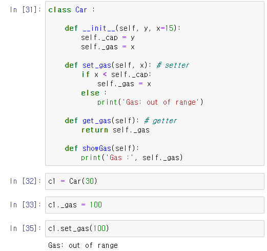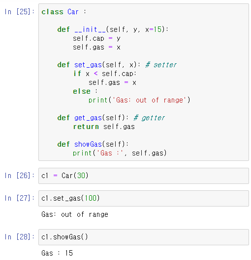 In[26]에서 30인자 값은 __init__( )함수 호출될 때 y 매개변수 값이 되고, 그 값은 결국 self.cap 값으로 저장된다. 즉, 현재의 self.cap 값은 30이 된다. 참고로, self.cap은 Car 객체의 연료탱크 용량을 나타내는 변수로 사용되었다. 즉, In[26]에서 연료탱크의 크기가 30인 Car 객체를 하나 만들고, 이제부터 그 객체를 c1이라고 부르겠다는 의미다. In[27]에서 이 객체에게 gas 값을 100으로 바꾸라고 요청했다. 아마 c1 객체를 초대형 SUV나 버스 쯤으로 생각한 모양이다. (인터넷으로 버스의 연료탱크 용량을 찾아봤더니 300~400 정도라고 한다). 하지만, 경차인 c1은 그런 요청(가솔린을 100리터나 담으라고 하는 요청)을 받아들일 수는 없겠다. 그래서 'Gas: out of range'라는 거절 메시지를 출력한다. 당연히 현재값은 초기화할 때 셋팅된 15값으로 남아있다 ( In[28] 참고)