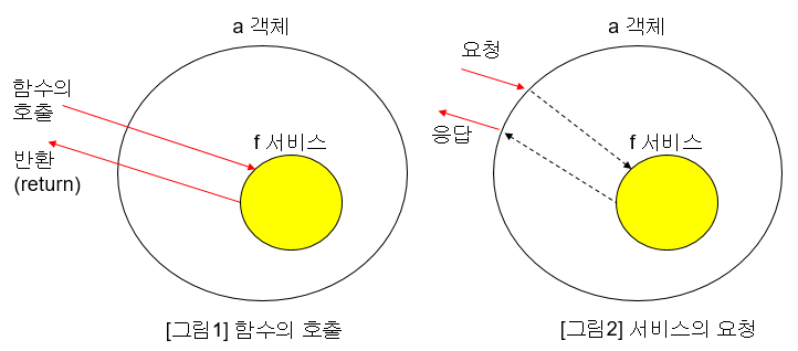 보통 요청 (request) 은 서비스 (service) 와 연관된 용어이다. 서비스를 제공하는 역할을 하는 무엇인가를 보통 서버 (server)라고 부르고, 그 서버에게 무엇인가를 요청하는 역할은 클라이언트(client)라고 부른다. 그래서, 이렇게 정리할 수 있겠다. 어떤 클라이언트가 어떤 서버에게 어떤 서비스를 요청한다. 이러한 그림을 우리의 문제와 비교해 보면, 클라이언트는 우리(we)가 되고, 서버는 a 객체가 되고, 우리가 서버에게 요청한 서비스는 f 가 되는 셈이다. 그런 의미에서 a 객체의 f( ) 함수를 호출한다라고 하지 않고 요청한다라고 하며, 요청하는 서비스의 이름인 f 를 서버에게 전달하는 일종의 메시지 (message)로 해석한다. 다시 정리해 본다면, 우리가 a 객체가 f 라는 기능을 해 주기를 바라고 있다. 그래서, a 에게 f 해 달라고 메시지를 보낸다. 메시지를 받은 a 는 해당하는 함수를 "주체성을 갖고" 실행한다 (물론, 여건에 따라서 실행하지 못하는 경우도 있겠다). 그런 의미를 다음의 그림에서 한번 찾아보기 바란다. 객체 메쏘드의 호출을 함수호출로 이해하는 경우는 [그림1]과 같은 이미지일 것이고, 서비스의 요청으로 이해하는 경우는 [그림2]와 같이 생각할 수 있다. 당연히, 정답은 [그림2]이다.