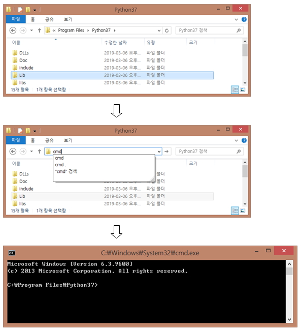 먼저 탐색기를 이용하여 파이썬 설치 폴더를 찾아가 보자. 그 다음에, 탐색기의 주소창을 클릭한 다음 cmd (* command 라는 단어의 줄임말) 라고 타이핑한다. 그러면 검은색 배경 화면의 명령 프롬프트가 뜬다. 다음에 한번 설명할 기회가 이있겠지만, 현재로는 텍스트 기반의 운영체제라고 생각하면 됩니다.
