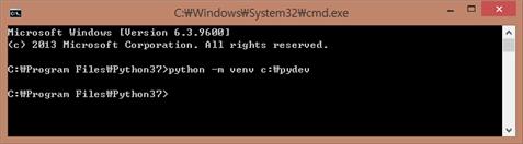 명령 프롬프트에 python –m venv c:\pydev 라고 입력해 보자. 그러면 약간의 시간이 소요된 후에 프롬프트가 나타난다. 별 다른 에러 메시지가 안 나타나면, 파이썬 가상환경이 제대로 만들어진 것이다. 여기서 입력한 명령어는 c:\pydev 라는 폴더 이름으로 가상환경을 만들어라는 뜻이다. (당연히, 폴더의 경로와 이름은 여러분들 마음대로 해도 됩니다.)