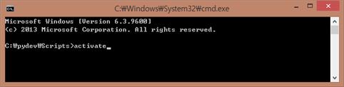 여기서 다시, 주소창에 cmd를 입력하여 명령 프롬프트를 실행한다. 쉘의 프롬프트는 현재의 폴더 위치가 c:\pydev\Scripts 임을 나타내고 있다. 프롬프트에 activate 라고 타이핑한다. 그러면, 현재 폴더에 있는 activate라는 이름의 배치파일 (배치파일은 실행파일이라고 전 페이지에서 얘기했다) 이 실행된다. # activate.bat 파일은 파이썬 가상환경을 활성화하는 명령어입니다.